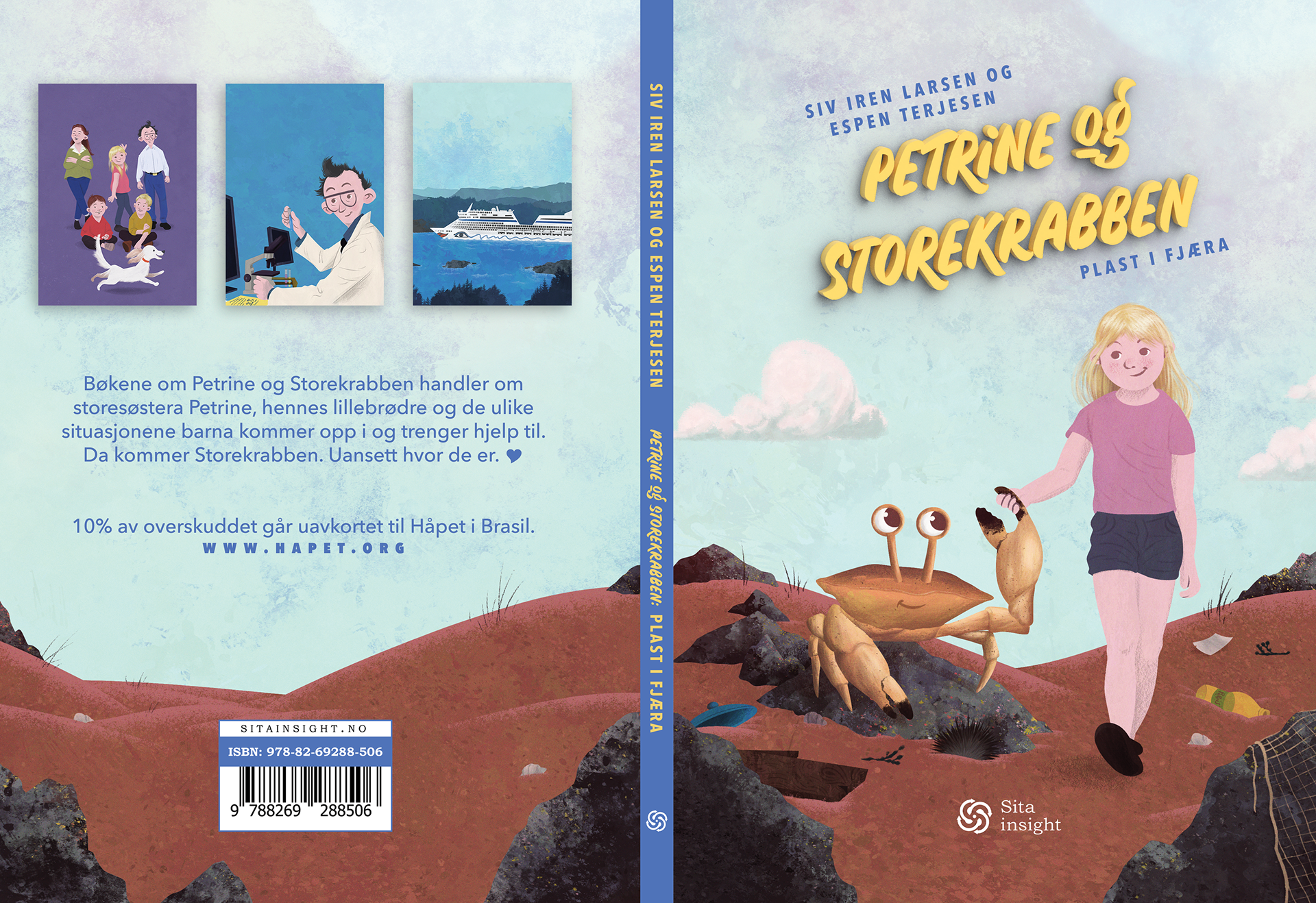 Bokomslag til Sita insights Petrine og Storekrabben: Plast i fjæren. Tegnet i Photoshop. Jeg har også illustrert innholdet i boken.