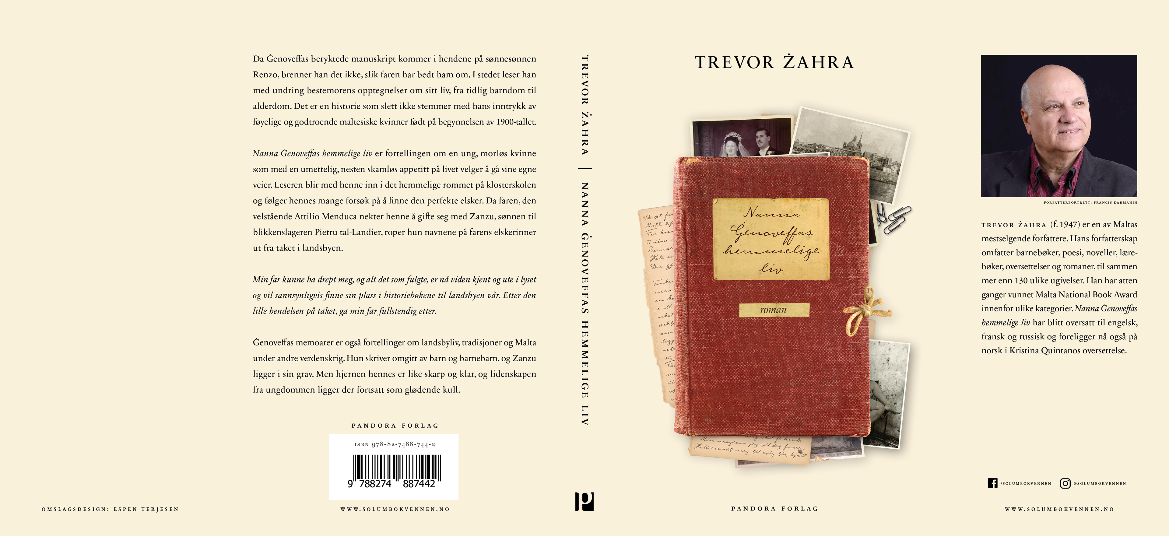 Bokomslag for Solum Bokvennens/Pandoras norske oversettelse av Trevor Żahra’s Il-Ħajja Sigrieta tan-Nanna Ġenoveffa. Laget i Photoshop og InDesign.
