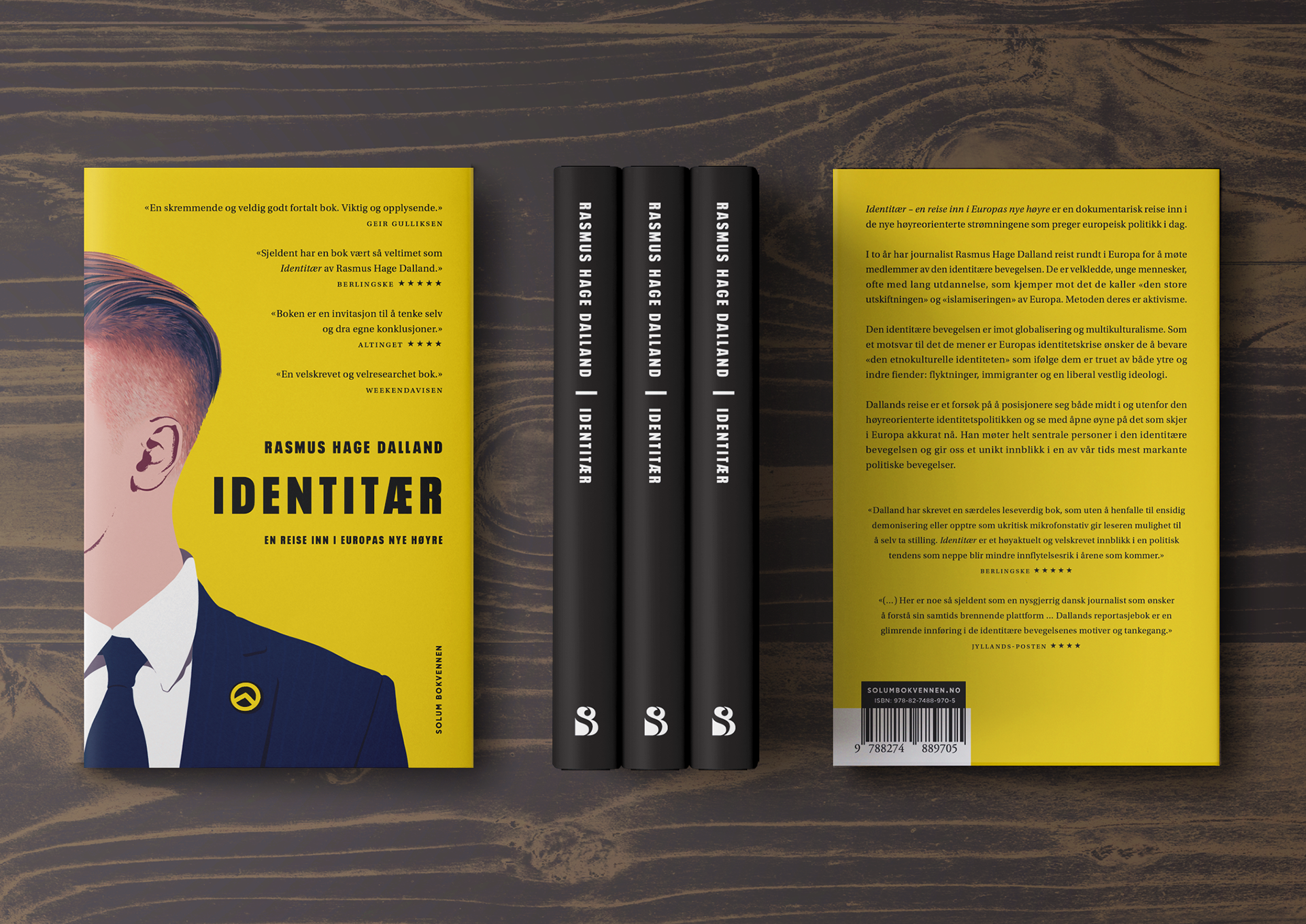 Bokomslag til Solum Bokvennens Identiær, en bok om en av de nye høyrebevegelsene i Europa, De identitære. Skrevet av Rasmus Hage Dalland. Illustrasjonene er tegnet i Photoshop. Satt sammen i InDesign.